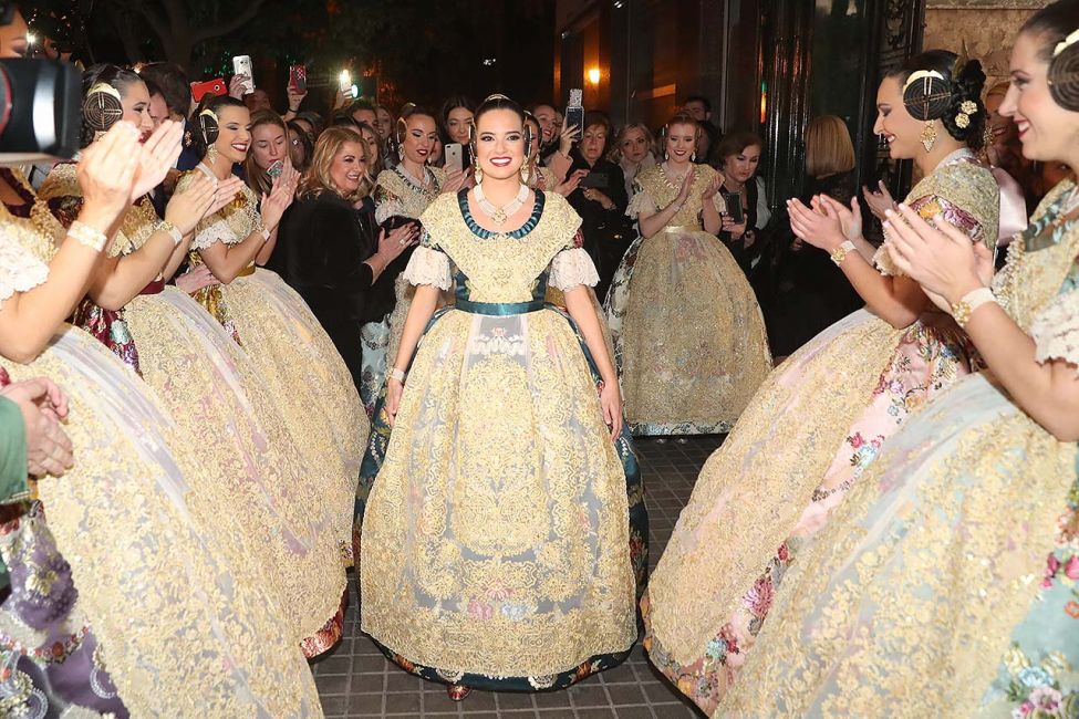 Passades les huit de la vesprada, la Cort d’Honor de Marina Civera esperava a la jove a les portes del seu domicili per acompanyar-la en el dia de la seua Exaltació com a Fallera Major de València 2019. Molt emocionada, Marina ha sigut rebuda entre aplaudiments de la seua Cort i de totes les persones allí presents, que han pogut conéixer, en primícia, el color del seu espolí teixit per Vives i Marí: Blau Atlantis.