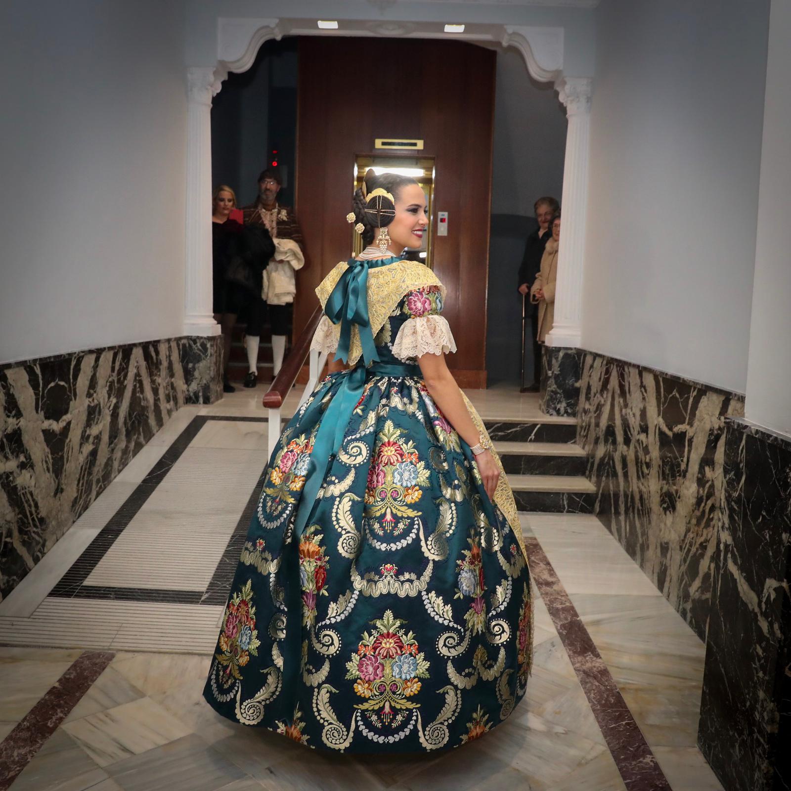 En esta ocasió tan important, les dotze senyoretes de La Cort d’Honor de Marina han estrenat els seus primers trages oficials. El teixit és un aixades de seda natural de nom Dignitat. Este disseny pertany a la col·lecció de dibuixos del nostre arxiu històric. És un dibuix de composició clàssica de finals del segle XVIII, basat en un important ram central rodejat per una orla de metall i xicotetes flors, teixit amb 16 colors de trama i metall or.